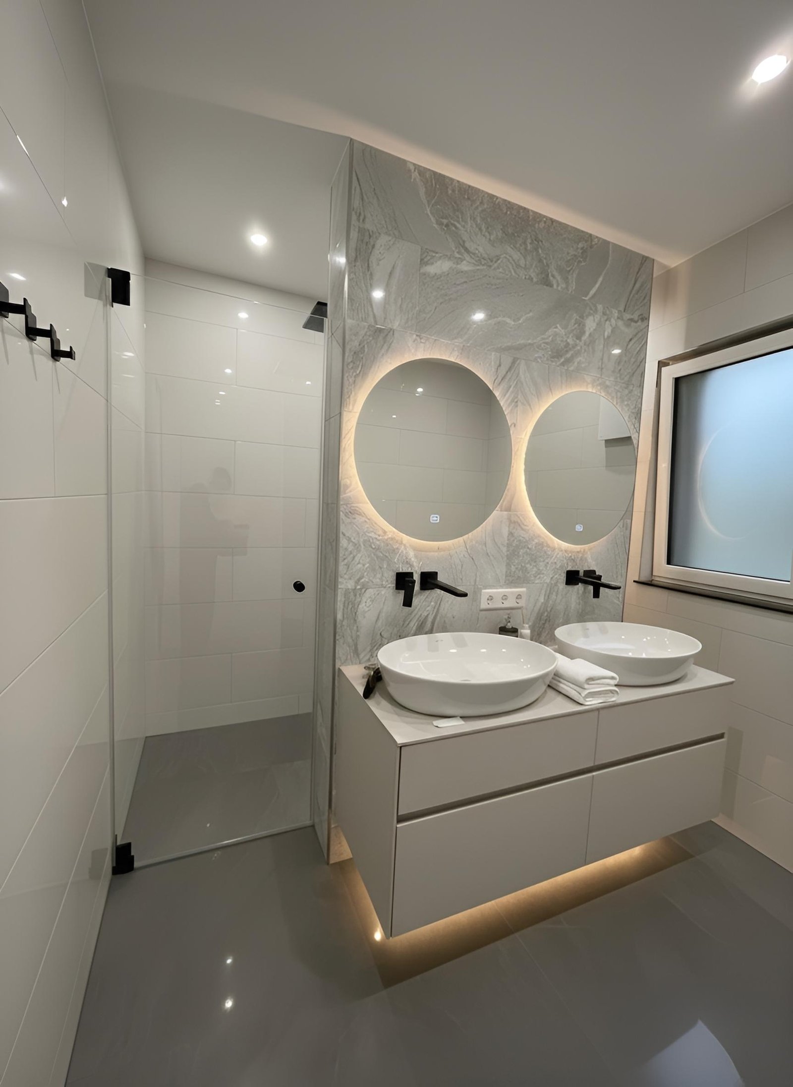 Dieses moderne Badezimmer vereint elegantes Design mit Funktionalität. Die großzügige, klar gestaltete Dusche schafft eine ruhige und einladende Atmosphäre, in der Entspannung und Stil perfekt harmonieren.