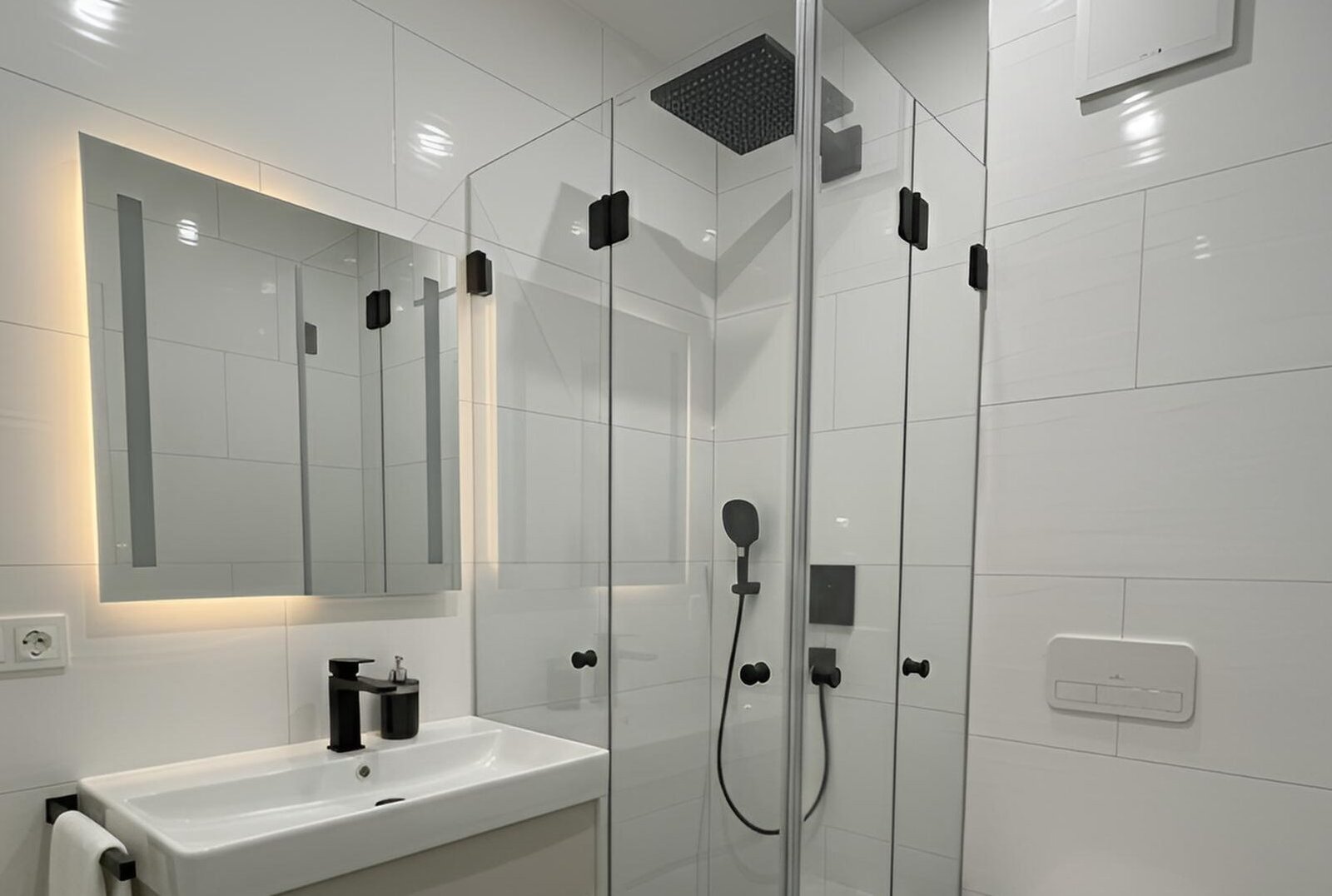 Modernes, stilvolles Badezimmer mit eleganter Dusche und zeitgemäßem Design.